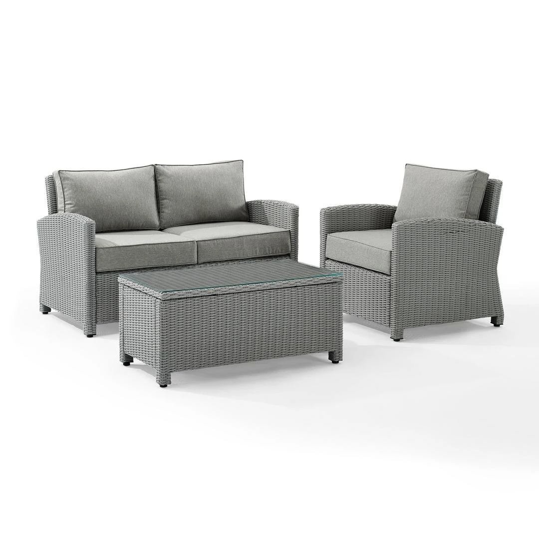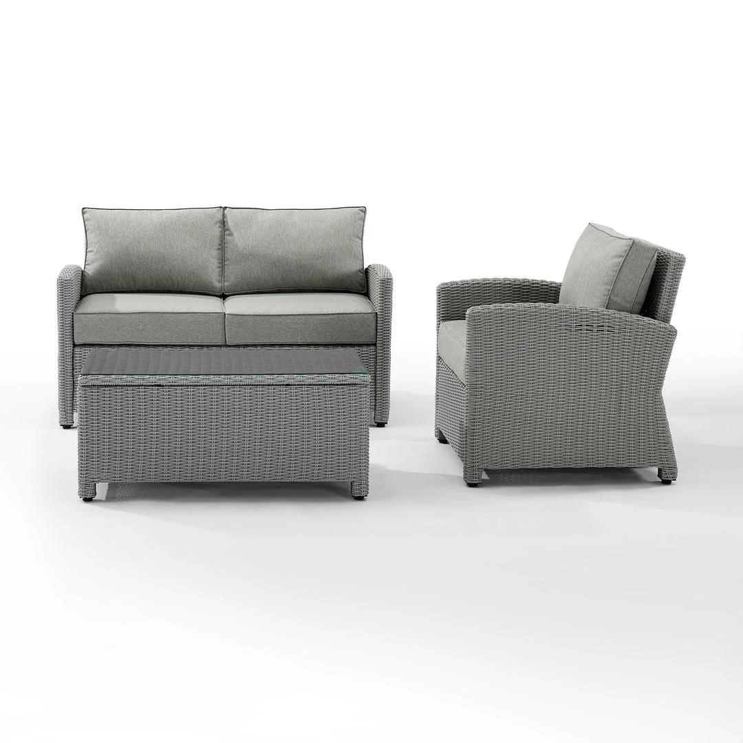 Whether you are lounging solo or entertaining a group, the Bradenton 3pc Conversation Set fits the bill. Each piece of the set features sturdy steel frames wrapped in beautiful all-weather wicker. The loveseat and armchair are stylish and comfortable with gently arched arms and thick moisture-resistant cushions. A glass-top coffee table ties the seating arrangement together making outdoor entertaining a breeze with the Bradenton conversation set.