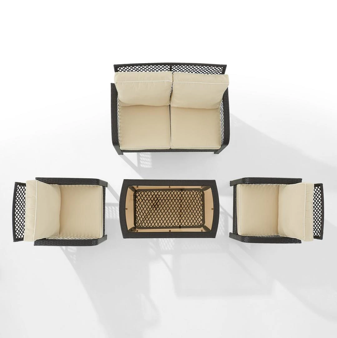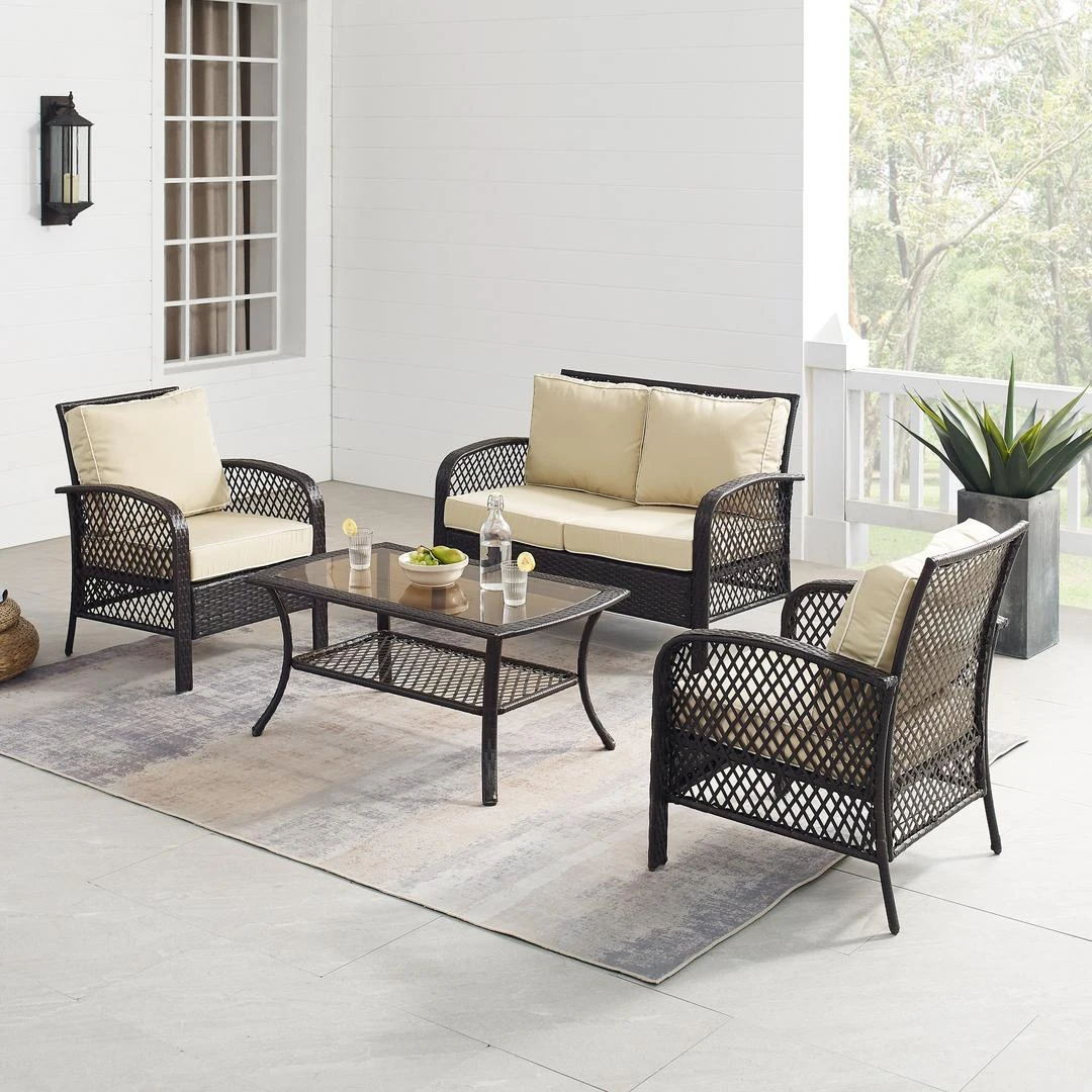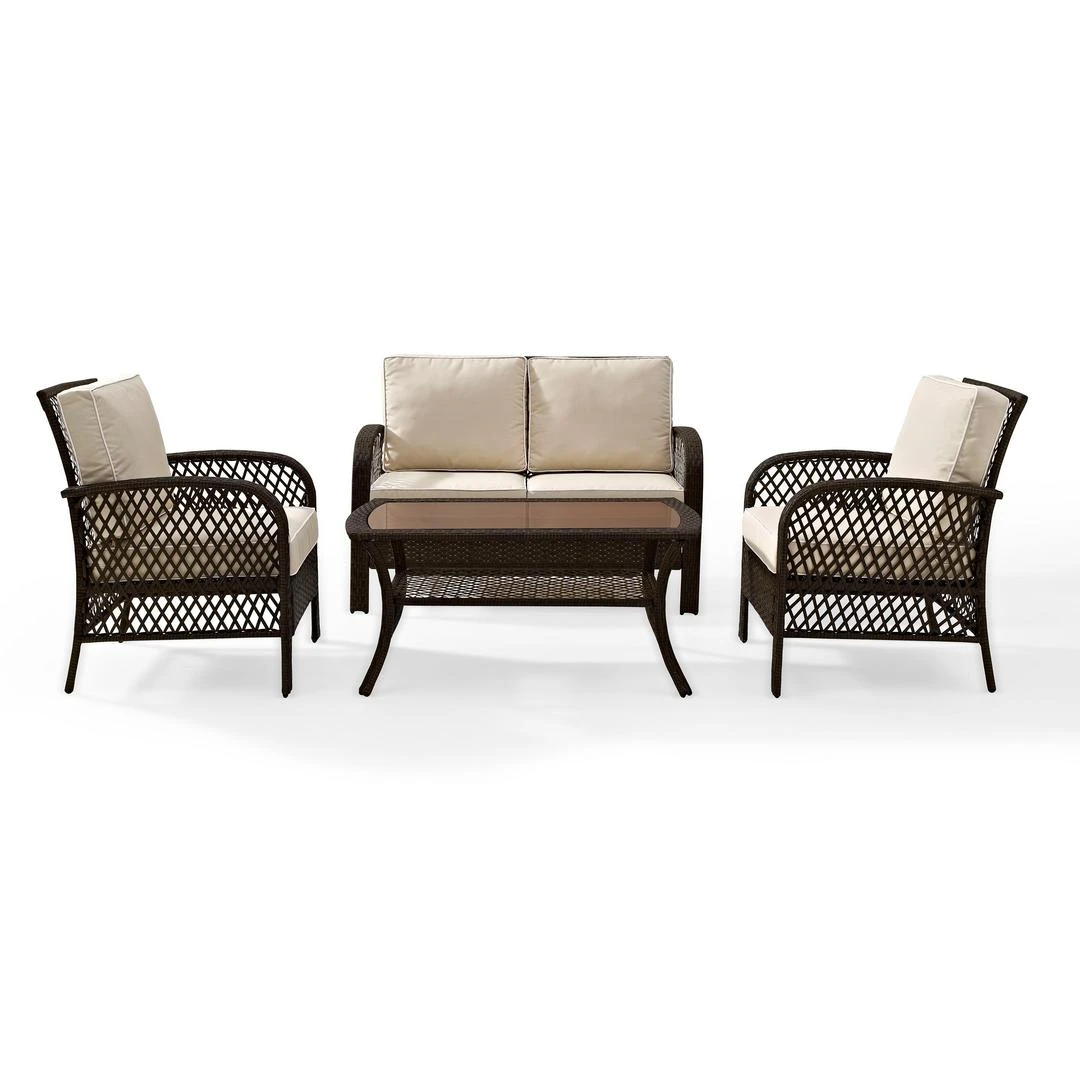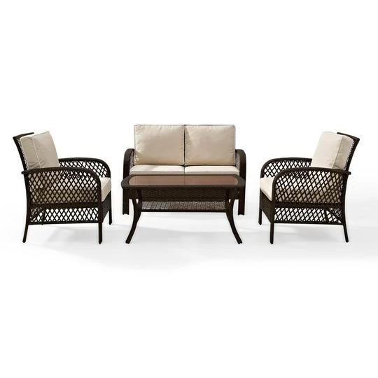 Crosley Tribeca 4-Piece Outdoor Wicker Seating Set, in Brown wicker with Sand colored cushions. The Tribeca Collection from Crosley is equally suited for a casual get together or a big event. Sturdy and stylish resin wicker furniture is comfortable, easy to maintain, and built to last for many summers seasons.
