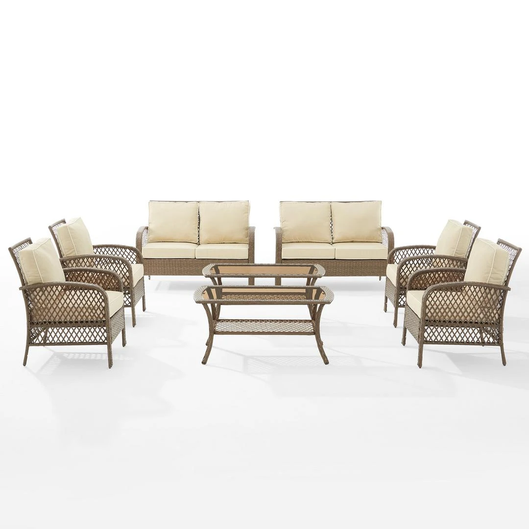 Gather friends and family for a day of relaxation with the Tribeca 8pc Conversation Set. With a unique lattice design, the loveseats, chairs, and coffee tables feature all-weather resin wicker over powder-coated steel frames. The seat cushions are covered in moisture-resistant dyed yarn polyester, while the glass tabletop coffee tables provide ample space for drinks and snacks. Offering exceptional flexibility with multiple seating and table options, the Tribeca conversation set can be arranged in a variety of ways to meet your entertaining needs.