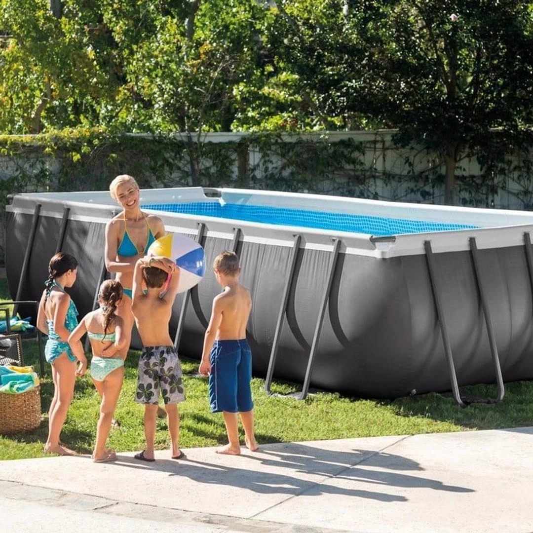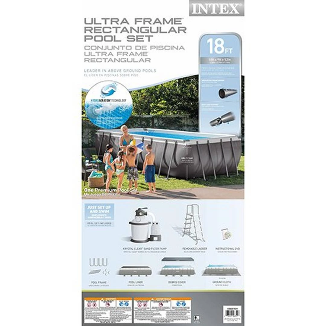 Get ready for the best summer yet with the Intex 26355EH Ultra Frame 9′ x 18′ Rectangle Metal Frame Above Ground Pool Package! The Intex 26355EH Above Ground Pool Package is 9′ wide, 18′ long and is 52″ deep. The above ground pool holds approximately 4,500 gallons.