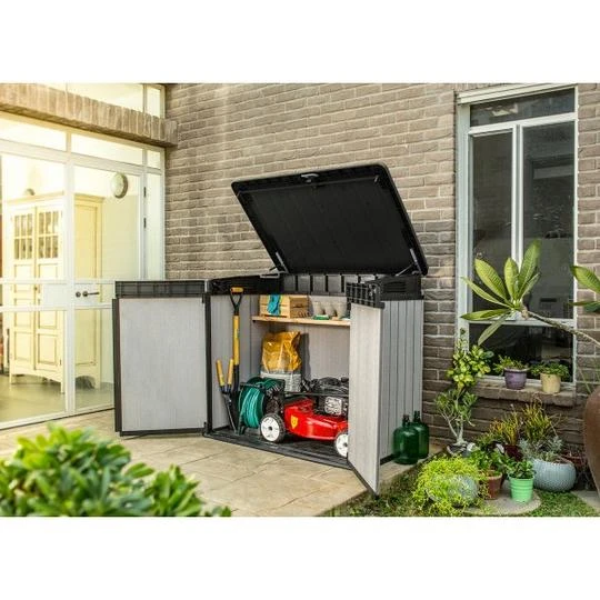 Organize all your garden tools & outdoor accessories in a secure, dry environment with the Keter Elite store horizontal storage shed. Constructed of weather-resistant resin, this shed features one-of-a-kind detach panels, which have a textured, wooden look & can be painted to match your home or outdoor living space. Strong & durable, this shed boasts reinforced double-wall panels & will not rush, dent or peel. It is easy to assemble with its tongue & groove panels. The double doors have chrome hinges & a lockable metal handle to ensure smooth operation & security.