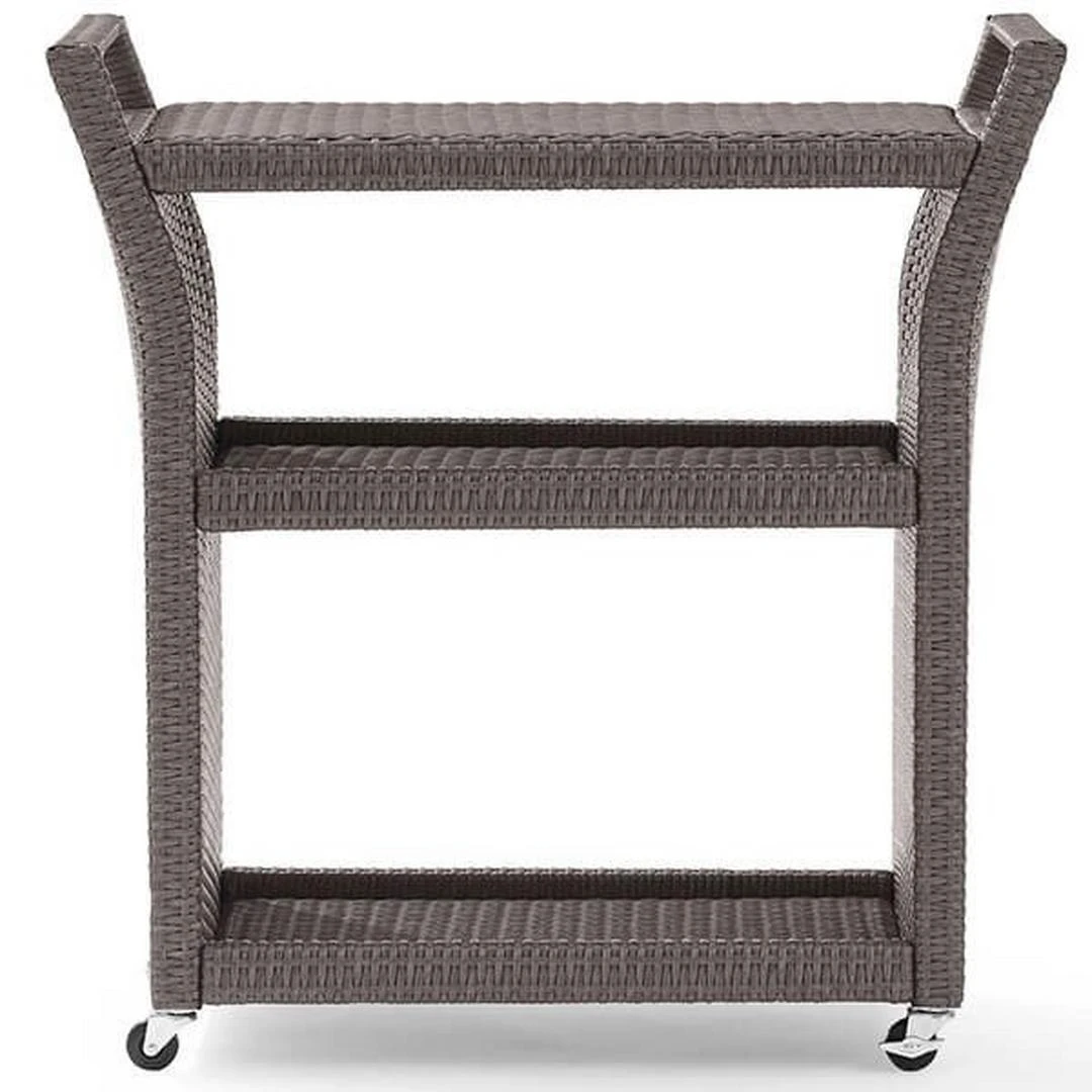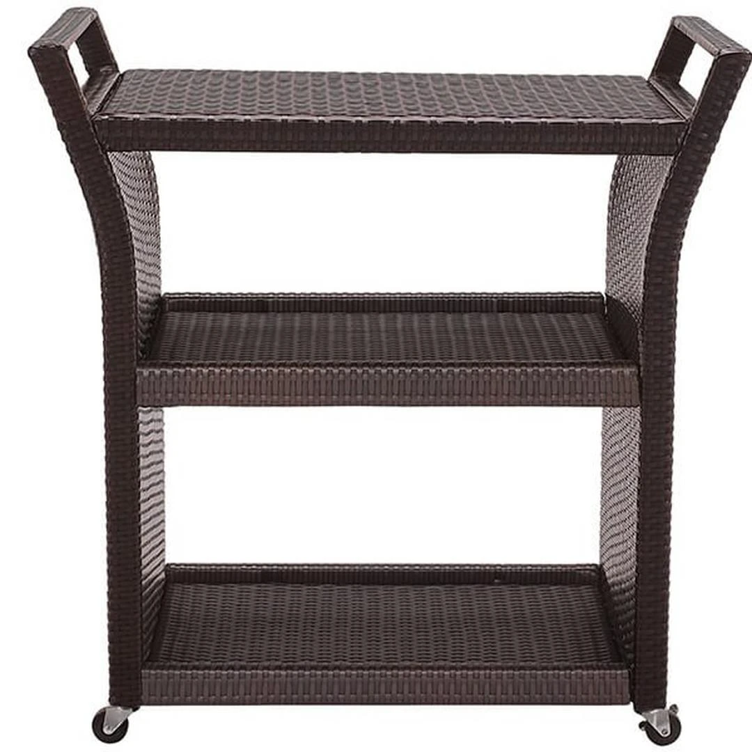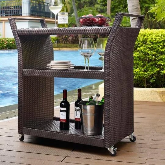 Bring bar entertaining outside with the Palm Harbor Bar Cart from Crosley. This wheeled cart offers rolling convenience to the poolside or patio with a wide serving surface and open storage below for ice buckets and liquor. Steer with the side handles, or use them for a handy towel bar. Constructed of woven weather-resistant wicker over powder-coated steel, nothing can get between this sturdy bar cart and the next outdoor happy hour.