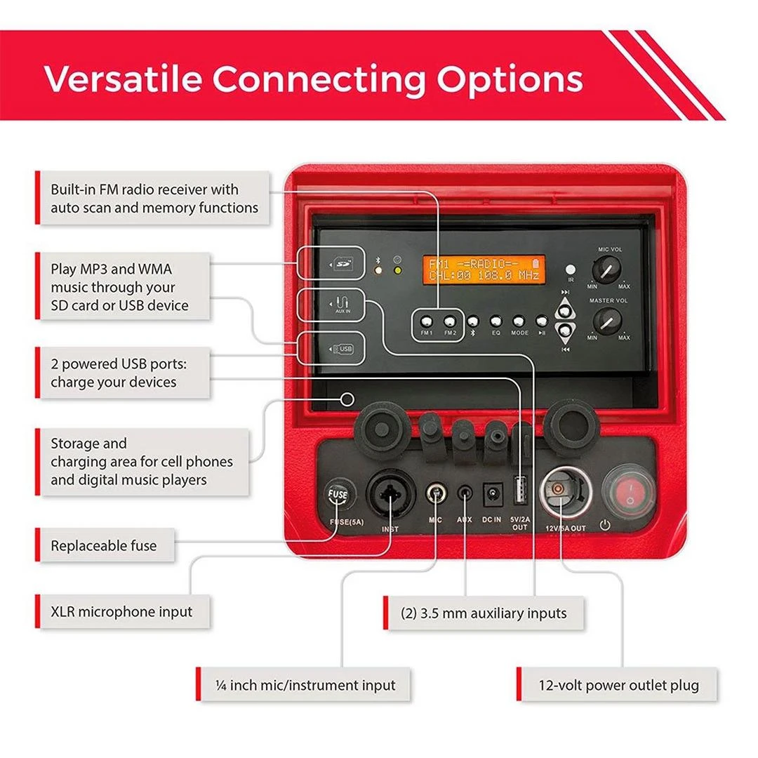 - VERSATILE CONNECTING OPTIONS (1) XLR microphone/instrument input, (1) 1/4-inch instrument input, (1) 12volt power outlet plug (cigarette lighter port), (2) powered USB ports and (2) 3.5mm auxiliary input